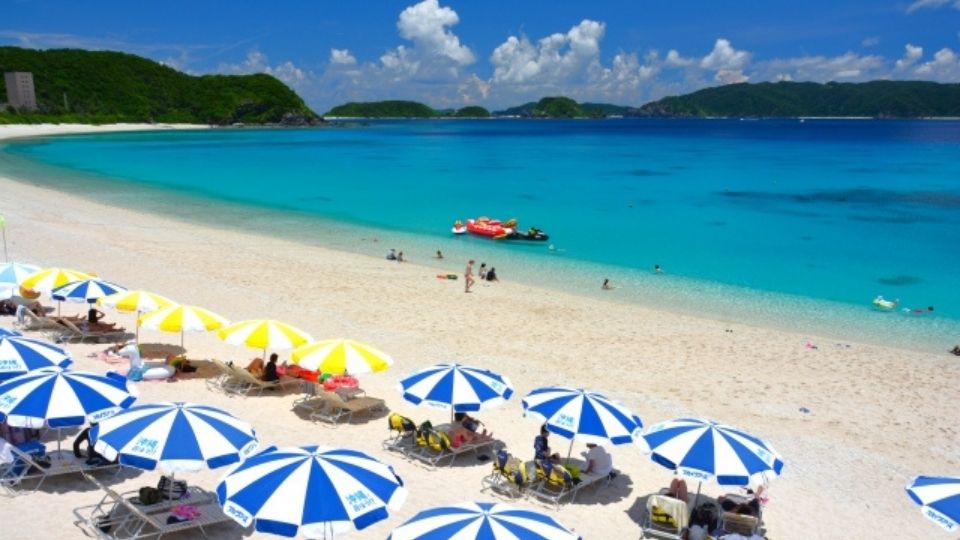 アジアンテイストな入口を抜けると、左手側にまっさおな海が広がっています。