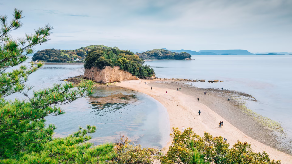 1日2回、潮が引くと砂の道が現れ、向こう側の島まで歩いて渡ることができます。