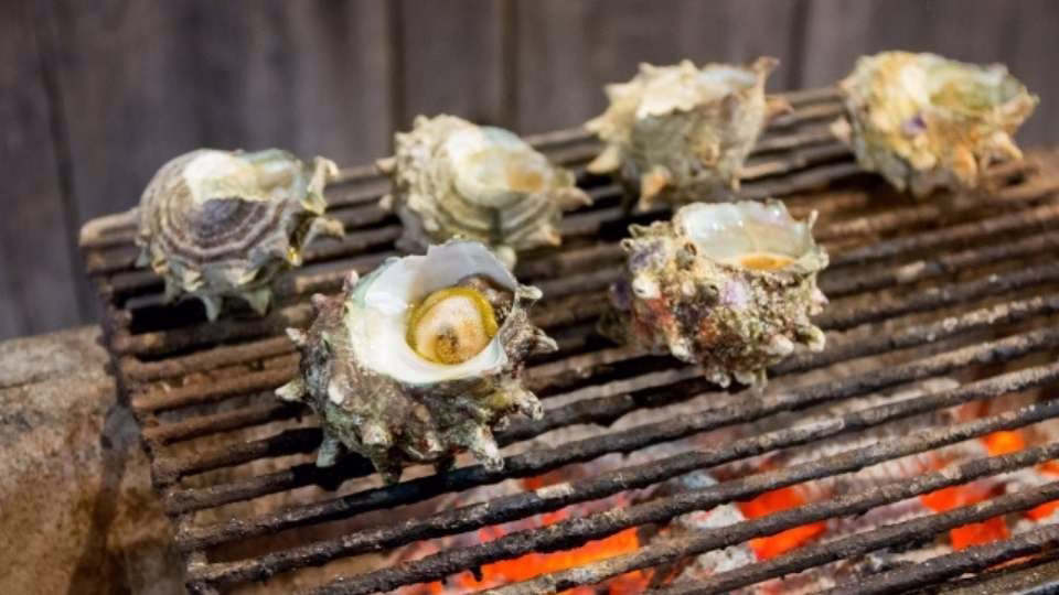 - ① サザエのつぼ焼き: 初島といえばサザエ。店先で焼かれる香ばしい醤油の香りに誘われます。身が大きく、コリコリとした食感は鮮度抜群だからこそ。