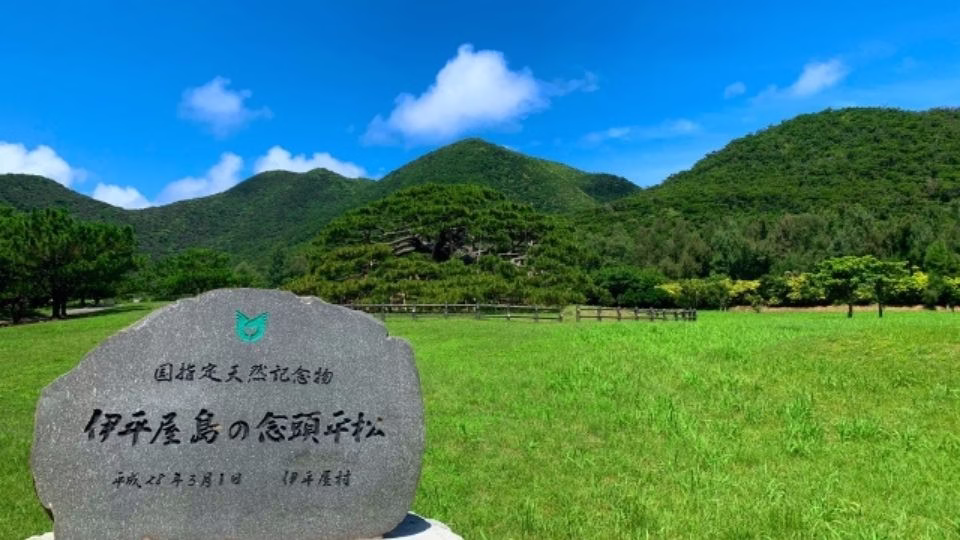 樹齢300年以上、新・日本名木100選にも選ばれた伊平屋島のシンボル。地面を這うように横へ広がる独特の樹形は、まるで巨大な緑の傘のよう。その姿は「日本一美しい松」とも称されます。