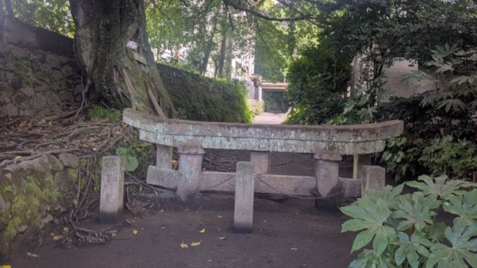 1914年(大正3年)の大噴火により、わずか1日で高さ3mあった鳥居が笠木(最上部)だけを残して埋まってしまった場所。火山の脅威を後世に伝えるため、当時のまま保存されています。隣接する中学校の生徒たちが今も清掃を行い、大切に守られている姿にも胸を打たれます。
