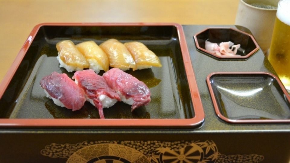 - 島寿司(しまずし): 鰆(サワラ)などの白身魚をカラシ醤油のタレに漬け込み、甘めの酢飯で握った郷土料理。ワサビの代わりにカラシを使うのが小笠原流です。