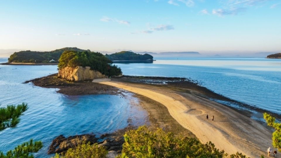 小豆島と余島の間、干潮時にのみ現れる砂の道。1日1〜2回、約2時間だけ出現する幻のスポット。「天使の散歩道」「恋人の聖地」として人気で、大切な人と渡ると願いが叶うという言い伝えがあります。潮見表で干潮時間を確認して訪問を。早朝や夕暮れ時が特に美しいです。
