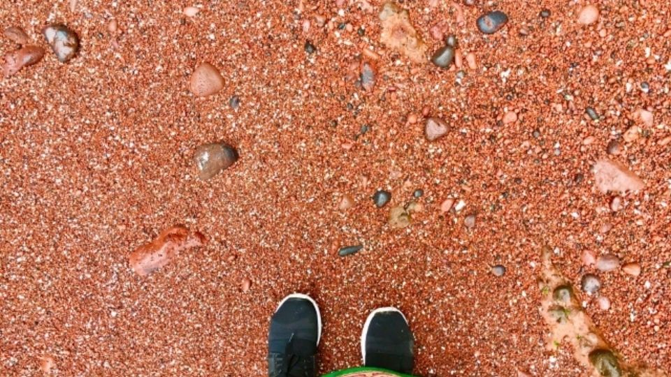 赤波江(あかばえ)の海岸に立つと、足元には剥き出しになった赤い地層。そのすぐ先には、どこまでも透明な群青色の海が広がります。波が引くとき、赤い礫同士がぶつかり合って奏でる「カラカラ」という乾いた音。その音を聞きながら、赤い土の上に座っていると、自分が最果ての離島の一部になったような、不思議な一体感に包まれます。