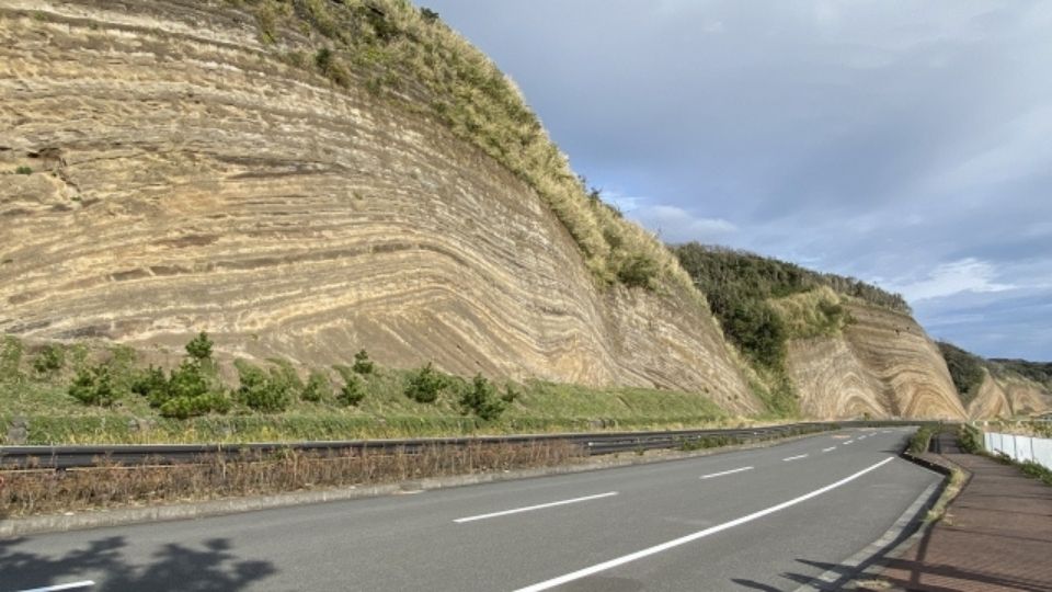 島一周道路を走っていると突然現れる「地層大切断面」。約1万5千年分、数百回もの噴火によって積み重なった火山灰が美しい縞模様を成しています。そのスケール感はまさに巨大なバームクーヘン!道路沿いにあり、ふらっと立ち寄って写真に収めるには最高のスポットです。