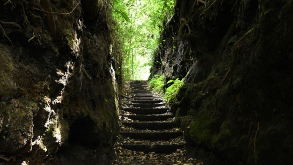 島の北東部にある「泉津(せんづ)の切り通し」は、近年SNSでも話題のパワースポット。二つの巨大な杉の根が、まるで壁を守るかのように絡み合い、その間に階段が続く光景は神秘そのもの。初夏の木漏れ日が差し込む時間は、まさに息を呑む美しさです。