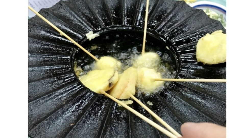 また、大島といえば椿。食用として精製された「椿油」で、新鮮な魚介や明日葉を目の前で揚げる「椿フォンデュ(オイルフォンデュ)」は、この島ならではの贅沢です。さらりとした椿油は素材の味を邪魔せず、衣はサクサク。初夏の陽気の中で、ビールと一緒に味わうのは至福のひとときです。